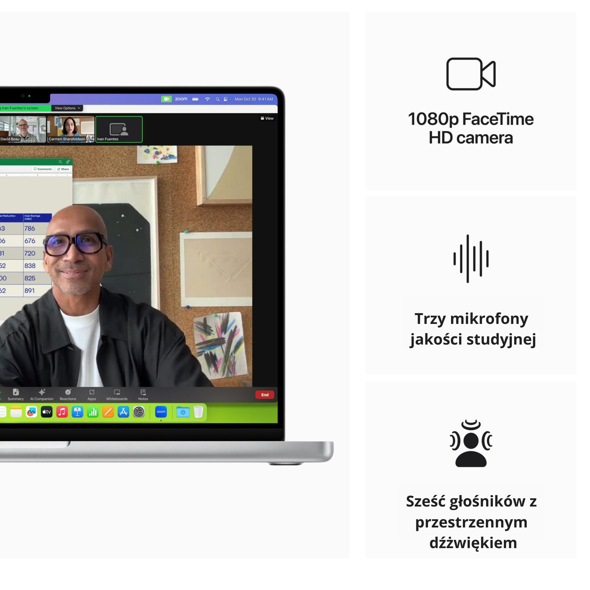 Kamera FaceTime HD o rozdzielczości 1080p zapewnia wyraźny obraz, pozwalając na prowadzenie rozmów wideo w jeszcze lepszej jakości, nawet przy słabym oświetleniu. Zintegrowane mikrofony z technologią redukcji szumów zapewniają czysty, profesjonalny dźwięk i eliminują zakłócenia, czyniąc MacBooka Pro idealnym narzędziem do komunikacji i pracy kreatywnej.